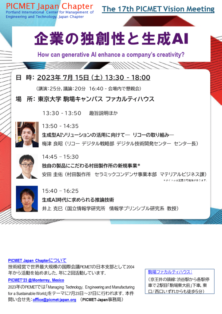 2023年7月15日に,東京大学内で第17回PICMET Japan Vision Meeting を開催いたしました.みなさまご参加ならびに活発な意見交換を有難うございました.